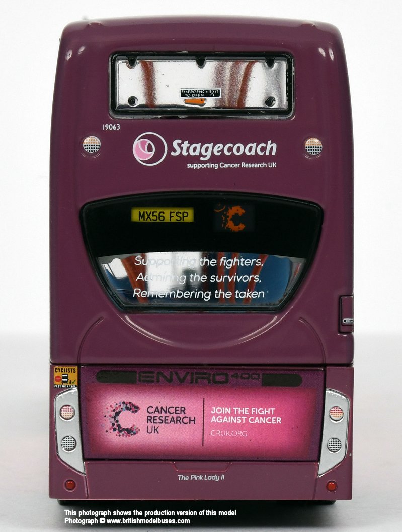 ADL Enviro400 - Stagecoach South (Cancer Research UK livery) - Destination: Cancer Research UK | 19062 | MX56FSP | - | 450 | 4/23 |