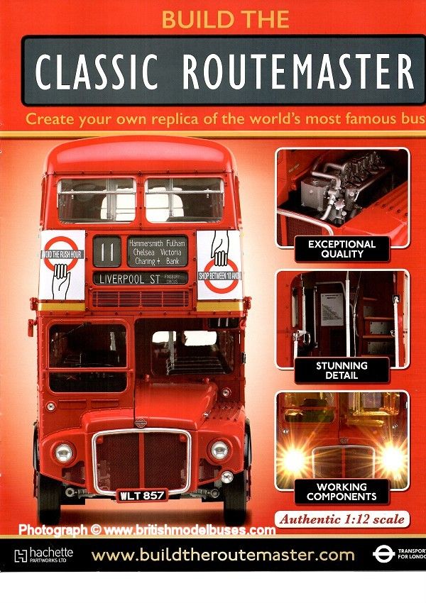 Starting in January 2018 and during the early part of 2018, Hachette Partworks carried out an extensive advertising campaign with television adverts, flyers in publications and on social media This model was initially launched in spring 2015, see my report dated 22nd April 2015, when I reported that Hachette Partworks had released a build your own Routemaster model in 1:12th scale. The parts of the model would be released weekly together with a magazine and instructions of how to build your model. On 8th June 2015, Brett Colley wrote to me advising that he had been contacted by Hachette Partworks and advised that the production had been temporarily suspected. Brett wrote to me again during January 2018 and advised me that the model had been re-released and that full details can be found on the Hachette Partworks "Build your own Routemaster" website. Full details are on the website CLICK HERE The model will be released in 130 weekly issues, with full instructions on how to build. The first magazine costs £1.99, the second £4.99 and the subsequent 128 issues @ £8.99 each. The total cost of the model when finished will be in the region of £1150.00. The model represents RM857 (WLT857) on route 11 to Liverpool Street. The website states: "Made of durable materials and including working elements such as headlights, your model is the ultimate celebration of a classic design. Careful attention to detail has been paid to ensure your model is as close as possible to an exact replica of the original 1966 Routemaster RM 857, plus no glue is needed and parts are pre-painted making it easy-to-build, even if you have no modelling expertise". The website lists the benefits of subscribing to the series "Each month you will receive 4 issues delivered to your door with free P&P. Each issue costs £8.99, with the exception of issue 1 at £1.99 and issue 2 at £4.99. As part of your subscription benefits, one of your issues in your first delivery will be FREE and you will also receive 5 FREE gifts during the course of your collection". After much deliberation and soul searching, I decided to subscribe to the series and will photographing each weeks magazine instructions and construction to show the complete build from start to finish. I will also feature each of the free gifts that you receive as a subscriber which are featured on the website. I have shown below, the real RM857 which I photographed at the North Weald Bus Rally on 21 June 2015, a photograph from the Hachette Partworks website and a couple of photographs of magazine issue 1 which I purchased from WH Smith to see what it was like. Photographs taken by me of the magazine pages are purely to illustrate the build stages, so that the entire process can be followed from the start to the completed model. The copyright of Hachette Partworks is acknowledged. To follow my build of the model, click on the links below to view each stage of the construction: |