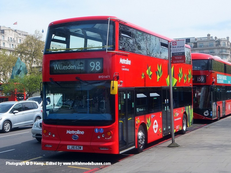 BYD K8SR Electric Bus Metroline These photographs show Metroline fleet number BYD1471 (LJ16EZM) The BYD K8SR is described on the BYD website as "the world's first pure electric zero emission double deck bus". It was designed and built by BYD in China and entered service with Metroline in the spring of 2016. At the time of writing, BYD1471 is one of 5 buses fleet numbers BYD1471 to BYD1475 operated by Metroline on route 98 between Willesden Bus Garage and Holborn Red Lion Square. In mid January 2017, I was made aware of a 1:64th scale diecast model manufactured by BYD and on sale at Hong Kong model shop Network Shuttle. The model features fleet number BYD1471, notably the model is not displaying a front index plate and is in predominately red livery as opposed to the the red and green leaf "Cleaner Air" livery displayed on the bus in service.