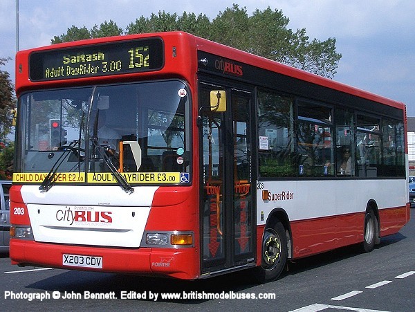 This photograph was taken in Saltash having just crossed the Tamar Bridge on Thursday 13th September 2007 and shows fleet number 203 (X203CDV). This is the actual vehicle as represented by Creative Master Northcord Ltd model UKBUS3028 Photograph © John Bennett |