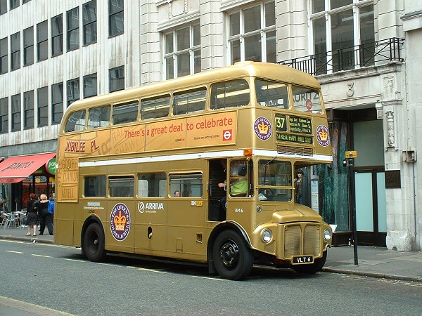 To compliment the photograph above, this one taken in Oxford Street, London on 14 September 2002 shows RM6 (VLT6) in Gold livery with full adverts. This is the actual vehicle released as EFE model 15633 Photograph © John King www.transporthistory.co.uk |