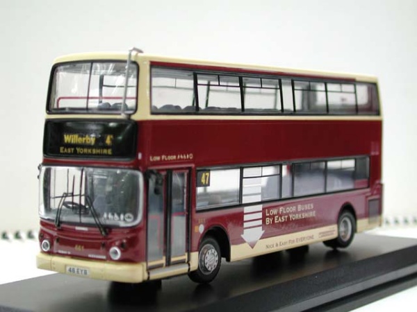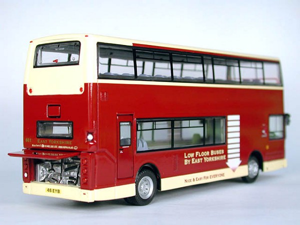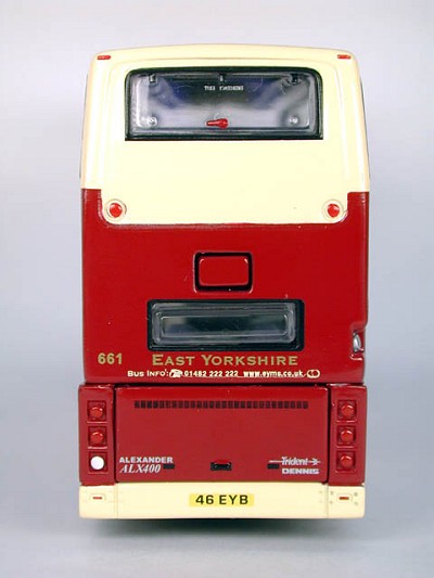 By Terry Stapley: East Yorkshire Motor Services Limited Dennis Trident Alexander ALX400 Registration Number 46 EYB Fleet Number 661 on route 47 to Willerby. This is another superb model from Creative Master Northcord Limited, and the second single door version. Comparing the model with a photograph of the prototype, the livery and graphics are excellent right down to the logos (wheelchair, mother & child, buggy etc) in the windscreen. One comment I have regarding the tampo printing is that K.W. has been printed instead of U.W. for the unladen weight, but this is small enough not to be noticeable. The front destination screen is behind glass, whereas the side destination number is tampo printed and the rear one is painted over. As is usual for CMNL castings the engine cover opens to reveal a very detailed engine and on the inside there are no hideous poles. Also on the inside, the ceilings have the interior strip lights picked out and the front grab rail in the upper deck in the correct orange colour. All in all, an excellent model that will grace the shelves of any display cabinet. |