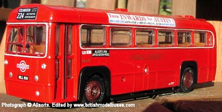 photograph NEW MODEL ANNOUNCED BY ALLSORTS Press Release – February 2006To continue the series of buses from the western parts of London Transport, Allsorts Collectable Models, of Maidenhead are pleased to announce the expected release in May 2006 of AS02, an AEC RF in London Transport red livery, working route 224, to Colnbrook. RF521 formerly green was repainted red in 1956 and allocated to Uxbridge Garage. A Limited Edition of only 300 certificated models are being produced, with numbered certificate and brief history. Advanced orders now being taken at www.allsortsmodels.com or call the hotline (Mon – Fri 9-5pm) on 01628 823523. Priced at £29.95 including UK P&P. Orders by cheque, payable to Allsorts Collectable Models can be sent to Boundary Elms, Burchetts Green Lane, Maidenhead, Berkshire SL6 3QP. Cheques not cashed and credit cards not charged until the model is ready for despatch. Sorry, visitors strictly by prior appointment. The model, based on an EFE original, has been expertly refinished by LBRT of Hailsham E Sussex www.lbrt.me.uk The photograph below shows a pre production mock up of the model: