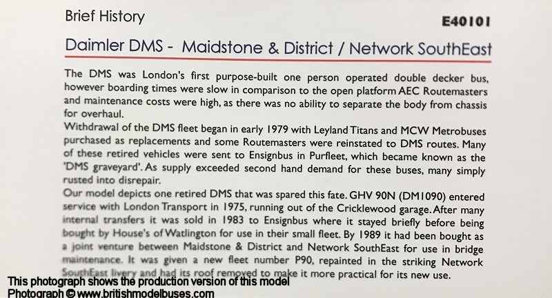 PHOTOGRAPHS Many thanks to Neil at Time Tunnel Models for forwarding the Bachmann news release to me and to Bachmann for sending me the two photographs to accompany the news: "We are pleased to announce a new model in our recently acquired Exclusive First Edition range. E40101 is an Open Top Daimler DMS in the dual livery of Maidstone & District and Network SouthEast and was officially launched at the 2016 Warley National Model Railway Exhibition at the NEC Birmingham. The DMS was London's first purpose built one person operated double deck bus, however it proved unpopular due to slow boarding times compared to the open platform AEC Routemasters and also maintenance costs were high, due to the way they were designed as there was no ability to separate the body from chassis for overhaul. Withdrawal of the DMS fleet began in early 1979 with Leyland Titans and MCW Metrobuses purchased as replacements and in some cases Routmasters were reinstated to DMS routes. Many of these now retired vehicles were sent to the dealer Ensignbus in Purfleet, which became know as the 'DMS graveyard'. As supply exceeded the secondhand demand for these buses many vehicles could not be moved or maintained and so simply rusted into disrepair. Our model depicts one retired DMS which was spared this fate. GHV 90N (DM1090) first entered service with London Transport in 1975 running out of the Cricklewood garage, after many internal transfers it was sold in 1983 to Ensignbus where it stayed for a short while before being bought by House's of Watlington for use in their small fleet. By 1989 it had been bought as a joint venture between Maidstone & District and Network SouthEast for use as a bridge maintenance vehicle. It was given a new fleet number P90, repainted in the striking Network SouthEast livery and had its roof removed to make it more practical for its new use. Our model uses revised tooling of the upper deck to portray the changes which were made to the real vehicle. E40101 includes an individually numbered limited edition certificate and has a recommended retail price of £44.95". To